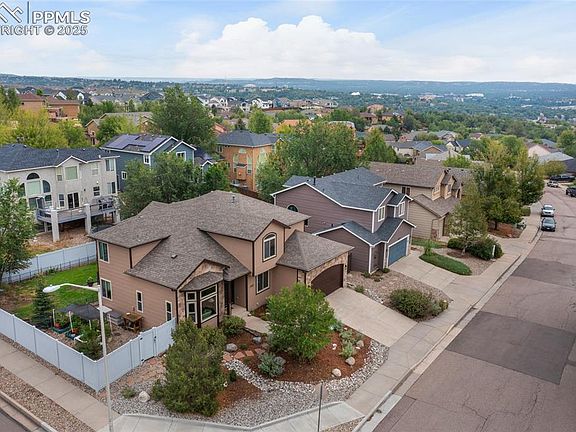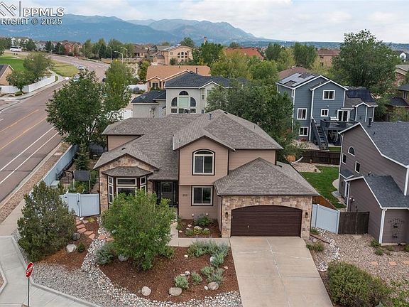 This former model home is situated on a desirable corner lot in the highly sought-after Crown Hill Mesa neighborhood, offering a blend of thoughtful upgrades, spacious design, and unmatched location. With a new roof, new exterior paint, new carpet, updated flooring, and fresh fixtures throughout, the home is move-in ready and beautifully maintained. Enjoy sweeping mountain views from your private backyard, complete with a large patio perfect for entertaining. Just two blocks from Bear Creek Park and within walking distance to Red Rocks Open Space, the dog park, and Cheyenne Canyon, outdoor adventure is right at your doorstep. Inside, the open and airy floor plan is filled with natural light, featuring both formal and informal living spaces. Enjoy a built-in sound system for great sound anywhere, and a central vac makes vacuuming simple. A dedicated main-level home office offers functionality, while the living room showcases a charming bay window and oversized windows throughout. The chef’s kitchen is designed for ease and style with warm wood cabinetry, a center island, and a five-burner gas range. The adjacent family room impresses with soaring two-story ceilings, abundant sunlight, and a cozy fireplace. Upstairs, the expansive primary suite includes a window seat, sitting area, and a luxurious five-piece en-suite bath. Two additional guest bedrooms are located on the upper level, with another in the finished basement—offering ample space for guests, hobbies, or multigenerational living. The basement also features a spacious family room, adding even more versatility to the home. Additional new updates include a new furnace (2020), new AC (2020), new dishwasher (2022), updated bathroom faucets (2025), new kitchen sink faucet (2022), and replaced window treatments (2016). Enjoy the beauty of mature landscaping, a fully fenced yard, and quick access to parks, downtown, and major highways. See Agent/Showing Remarks.