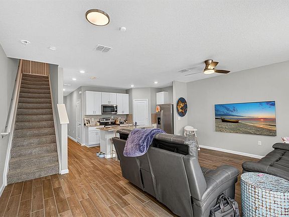 Welcome to the 2021-built community of Seaside, one of Stuart's most desirable newer neighborhoods. This beautifully maintained ''Pompano'' model townhouse features a bright, open-concept layout with 1,475 sq ft of living space, three bedrooms upstairs, 2.5 bathrooms, a versatile loft area, a 1-car garage with extra parking, and a fabulous open-air patio perfect for outdoor relaxation.Built with durable concrete block construction and full impact windows and doors throughout, this energy-efficient home showcases stainless steel appliances, granite countertops, 42'' white cabinetry, a large kitchen island, and modern finishes for stylish everyday living.