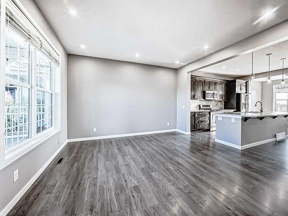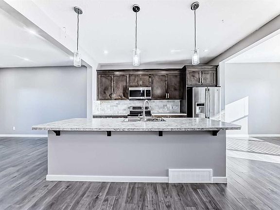 Low-maintenance laminate flooringModern kitchenStainless steel appliancesMassive islandUnder-cabinet and track lightingTwo-piece powder roomSpacious walk-in closet