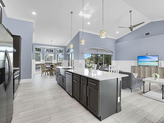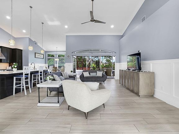 Discover the perfect blend of island living and modern comfort in this spacious, beautifully updated pool home, on an oversized lot. Ideally located just minutes from the famous white sandy beach of Marco Island, the home boasts of soaring ceilings, abundant natural light, and an open, airy floor plan that radiates warmth and character. Thoughtful design details set this home apart — wainscoting, crown molding, oversized windows, and recessed lighting on dimmers create an inviting atmosphere throughout. Quartz countertops in the kitchen, newer stainless-steel appliances, and an oversized island with a farmhouse sink — perfect for entertaining or everyday living. The main living area offers plenty of room for gatherings while maintaining a cozy, welcoming feel. Step outside to a private oasis complete with a large pool deck, paver patio with fire pit, lush lawn, mature mango tree, and an extra-large fenced-in back yard with lake views, and a gated side yard ideal for a garden, boat, or RV storage. The primary suite is a serene retreat, featuring a spacious ensuite bath with freshly painted white cabinetry for a bright, coastal feel. Extensive updates completed in 2020-2021 include a new roof, AC, water heater, plumbing, pool heater, and interior renovations. This is the island home you've been waiting for — move-in ready, income-producing, and full of charm. Come see it for yourself!