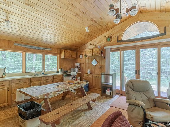 Looking for a hunting camp? This open-concept cabin on a wooded 5-acre parcel offers a bunk area that includes two full size mattresses and two twin size, eat in kitchen, and large living room, and includes both a covered rear deck and covered front porch! Outside, there is a roomy garage/shop that also includes a sauna and shower area, and a large storage shed, included in the sale is two generators and a 6-panel solar system that will need to be installed. Thie property is conveniently located on a recreational trail (snowmobile and ATV), near many waterways and boarders federal and commercial forest land. The cabin has cable ran for both antenna and satellite TV and also has both 12V and 110 power in the cabin and garage. The cabin does have a new 35,000 BTU space heater.