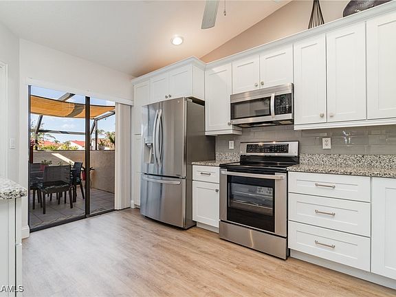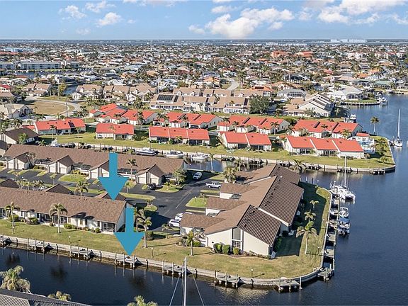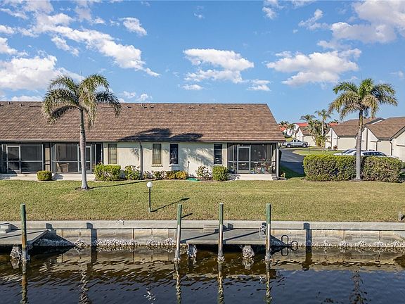 Motivated Seller! END-UNIT, SINGLE LEVEL, CANAL FRONT, DIRECT GULF ACCESS, DEEDED DOCK and SINGLE CAR GARAGE. New beginnings start here in this exquisite home, where luxury meets convenience. Beautiful recent total renovation! Nestled within the sought-after community of Dockside Villas / Punta Gorda Isles offering a unique living experience with breathtaking canal views. Exceptional Features include canal frontage, allowing direct Gulf access with a deeded dock just steps away from the rear lanai, perfect for sailboat enthusiasts. There is 30 amp power and water at the dock for your boat up to 33 feet. A short 15-minute journey via Buckley's Pass takes you to the open waters of Charlotte Harbor. Luxury upgrades are evident as you step inside, featuring custom plantation shutters throughout, barn doors, modern fans and lighting, and durable LVT flooring throughout, combining elegance with functionality. The heart of the home is its gourmet kitchen, which boasts granite counters for durable and stylish surfaces, high end LG appliances, a glass tile backsplash that adds sophistication and color, and white shaker cabinetry with soft-close drawers for a seamless experience. An artistic breakfast bar with a stone tile front creates a beautiful focal point for dining. This condo offers spacious living with two bedrooms, including a master bedroom that provides direct access to the back lanai, making it a perfect retreat. Two bathrooms designed for comfort and convenience, an attached garage that enhances security and storage options, and screened-in lanais both front and rear promote an indoor/outdoor lifestyle ideal for Florida's beautiful sunny weather. Enhanced comfort and safety features such as electric roll-down storm protection ensure safety during stormy weather. The new roof, recently replaced by the community, guarantees the structural integrity of the home. As an end unit, this home benefits from an additional large side window that fills the space with natural light—a feature not available in middle units. The prime location offers proximity to downtown, allowing easy access to shopping, dining, and cultural activities. Nearby city parks provide opportunities for relaxation and enjoyment, while proximity to Saint Andrews Golf Course and Punta Gorda Airport caters to both golf enthusiasts and frequent travelers. Embrace the vibrant Florida lifestyle and make this charming condo your new home in Punta Gorda. It is more than just a place to live; it is a gateway to new adventures and cherished memories.