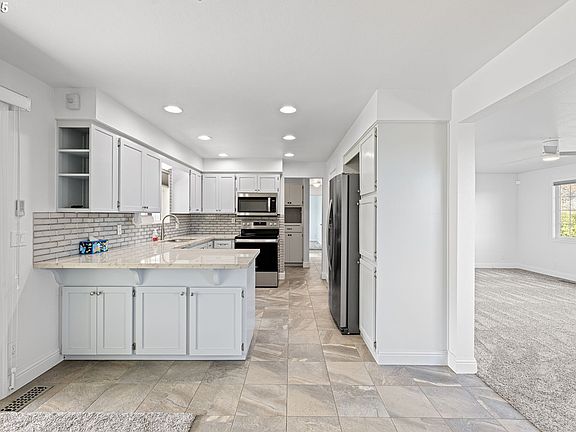 Spacious updated single level home on private .43 acres close to town. Kitchen features tile flooring, slab quartz countertops, undermount kitchen sink and tile backsplash. New carpet in several bedrooms and living room in 2023. Large primary suite offers a walk-in closet and tiled walk-in shower. Home offers a heat pump, RV parking& hookups, large covered patio & paved side yard leading to a spacious 24x30 detached garage /shop on separate meter with 200-amp service & new insulated garage door. Newer roofs & exterior sheathings on home and detached buildings. Garden/ tool shed, over 20+ raised garden beds filled with flower bulbs, asparagus and more. Plum & cherry trees, thornless blackberries, and more. NEW 2025 sand filter septic system being installed on property. Back on market- no fault of sellers- previous buyers could not perform per the agreement.