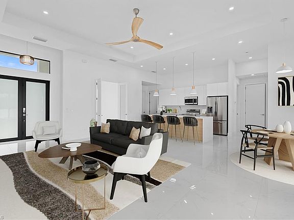 This elegant new construction home, built with hurricane impact windows and doors, offers 3 bedrooms + a den, 2 bathrooms, and 1,869 sqft of thoughtfully designed living space in the heart of SW Cape Coral. From the moment you enter through modern French doors, you’re welcomed by a bright and airy interior featuring polished marble tile floors and soaring ceilings enhanced by recessed lighting. The contemporary kitchen boasts quartz countertops, light wood cabinetry paired with sleek white uppers, and pendant lighting above a spacious island. The primary suite features two walk-in closets with custom built-in shelving, and a spa-style bathroom with a frameless glass walk-in shower and double vanity with quartz counters. Both secondary bedrooms are spacious and filled with natural light, complete with ceiling fans and generous closet space. A modern full bathroom with a glass-enclosed shower is conveniently located to serve family or guests and also functions as a pool bath. Additional highlights include a large laundry room and expansive sliding glass doors that seamlessly blend indoor and outdoor living. Step out to a covered lanai featuring a built-in outdoor kitchen, a sparkling private pool and spa, outdoor shower, and a fully fenced backyard—perfect for relaxing, entertaining, and enjoying the Florida lifestyle year-round. Just minutes from waterfront dining, Rotary Park, Gulf coast beaches. Some photos include virtual staging. *DESIGN SERVICES INCLUDED, MAKING IT EASY FOR THE BUYER TO FURNISH THE PROPERTY AS SHOW*