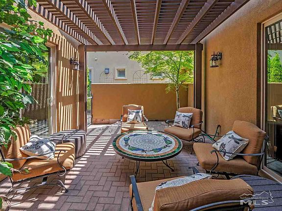Welcome to the sought after Mayberry Bungalows! This home is a rare find end unit with no attached walls! Low maintenance and move in ready with countless luxury upgrades including added windows for extra light, engineered hardwood floors, diamond laid oversized ceramic tile, crown molding throughout, cast fireplace with mantle, and professionally tinted windows for UV Protection and privacy! The Kitchen boasts high end Quartz Counter Tops with full Travertine Backsplash, and wired under cabinet lighting. Included in the sale are the upgraded stainless steel appliances, even the fridge which is less than 6 months old! This home also features an extended courtyard patio with private iron gate and lifetime metal pergola professionally engineered for Northern NV snow loads and installed with all proper permits and HOA permissions. Other notable upgrades include the travertine counters and extended backsplashes in all bathrooms, fully finished garage, pre-wiring done for sound and home theater system as well as security system. BONUS: Mounted TV and wired sound system in down stairs living room to stay and convey with home! Don't miss out on this hidden gem! Buyer and Buyer's Agent to Verify all Included in the sale are the upgraded stainless steel appliances, even the fridge which is less than 6 months old! This home also features an extended courtyard patio with private iron gate and lifetime metal pergola professionally engineered for Northern NV snow loads and installed with all proper permits and HOA permissions. Other notable upgrades include the Travertine counters and extended backsplashes in all bathrooms, fully finished garage, pre-wiring done for sound and home theater system as well as security system. BONUS: Mounted TV and wired sound system in down stairs living room to stay and convey with home! Don't miss out on this hidden gem! Buyer and Buyer's Agent to Verify all
