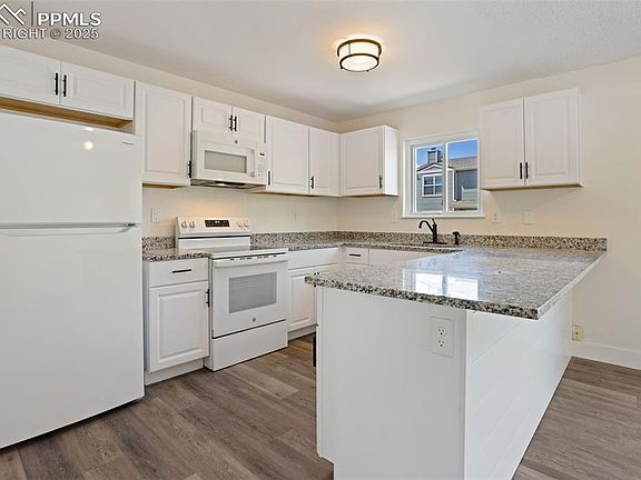 Welcome to this beautifully renovated townhome offering 3 bedrooms, 2 bathrooms, and a 2-car assigned garage. The main level welcomes you with a spacious living room, complete with a cozy wood-burning fireplace and built-ins, all set against new luxury vinyl flooring. The kitchen features views of the front range, brand-new cabinets, granite countertops, a pantry with custom wood shelving, and a single-bowl sink, along with space for casual dining and a walkout to the deck—perfect for enjoying Colorado’s mountain views. A stylish powder room with quartz counters, a tall vanity, and extra storage completes the main level. Upstairs, the primary suite boasts a double vanity, skylight, built-ins, quartz countertops, and luxury vinyl flooring. Two additional bedrooms showcase front range and Pikes Peak views, cozy carpet, and charming wainscoting accents. The unfinished basement, already plumbed for a future bath, offers endless possibilities for expansion or storage. Updates include new flooring throughout and upgraded kitchen cabinets-among others, giving the home a fresh, modern feel while leaving room for your personal touches. All appliances are included—Refrigerator, Washer, Dryer, and Gas Dryer—making this home move-in ready. Ideally located near shopping, restaurants, and everyday conveniences, and within the highly regarded District 20 schools, this townhome blends comfort, potential, and beautiful mountain scenery. Make this home yours today!