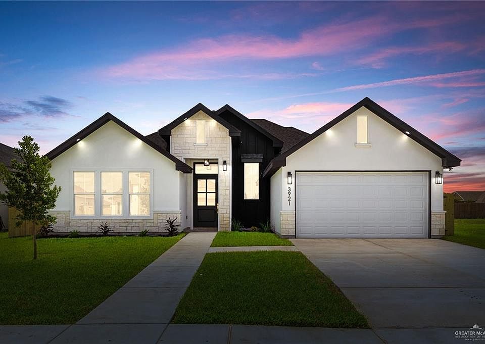 Stunning New Construction in North McAllen. 4 bedroom 2 and 1/2 baths, 2 car garage. This home is made to impress with its tall windows and expansive views of a huge backyard. 14 feet tall high ceilings to incredible details in Living, Kitchen and Dinning areas. 72" fireplace, Black/Gold Fixtures thru out the home. Stainless steel appliances included (stove, range hood, dishwasher and garbage disposal). You will also find a hidden pantry with quartz counter top. The main en-suite bathroom is just incredible from double vanity with an ample walk-in closet space and a private commode. The main bedroom has tons of great natural sunlight. It also includes Laundry Area with workstation, Mud room, 1/2 bath has exterior access to the large backyard, garage with added shelving. There's huge patio and porch areas that are perfect for evening gatherings.