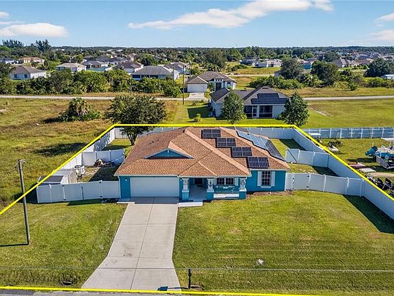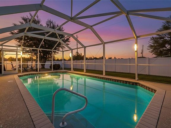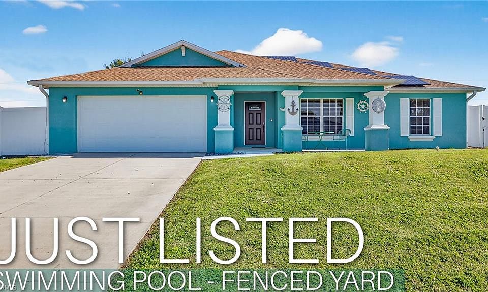 WELCOME TO THE BLUE LAGOON!! With its sparkling pool, solar power, Tesla battery system, impact windows and doors, large fenced in yard, tropical accents and cool coastal vibe, you will be happy to call the BLUE LAGOON your new home!! ASSUMABLE INTEREST RATE OF 2.78% on $295K! Features of this beautiful property include, welcoming great room floorplan, tile throughout (no carpet), soaring tall ceilings, renovated kitchen including 4-person raised breakfast bar with tiled bar wall, stainless steel appliances, Corian countertops, over and under counter lighting and gorgeous mosaic blue glass backsplash! Next you will find a large master suite with spa like en-suite bath highlighted by a gorgeous walk-in, dual head shower with frameless glass enclosure; large soaking tub and dual vanity. Continuing through you will be happy to find 2 large guest bedrooms, updated guest bathroom with newer walk-in shower, upgraded fans and light fixtures throughout, Rain Soft whole home water treatment system, Rain Soft Ultrafine II Reverse Osmosis drinking water system, smart thermostat and doorbell, video cameras and more!! Outdoors you will be blown away straight to Margaritaville with a huge, heated pool with interactive customizable lighting, large covered lanai, ELECTRIC ROLLDOWN HURRICANE SCREENS ON REAR LANAI, upgraded pool cage with 100 color customizable lanai lights, sun/grilling patio with gazebo, large abd fully irrigated backyard with vinyl privacy fence, bonus gate to allow for boat or RV storage and so much more! Age of Key Components are as Follows: Roof (2023), AC (2016 with newer coil and compressor), Eco- Efficient Water Heater (2021), Kitchen Range (2024). Other features include Generator with Two 100-gallon propane tanks, video cameras, Pit Boss Smoker Grill, patio set and awning and more!! This home can fully function in a power outage situation!! Home is located near shopping, dining, entertainment and all that Sunny SW Florida has to offer!! Call for your private showing today!
