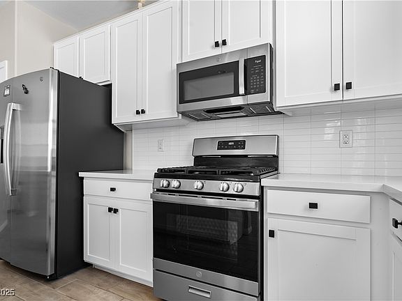 Home has paver driveway and covered front porch. Enter home to entryway which leads to the living room. Living room has a light fixture and center meeting sliding patio doors. Living room opens to kitchen. Kitchen has quartz countertops, island with breakfast bar, 42" upper cabinets, stainless steel appliances (fridge, stove, dishwasher), tile backsplash, and pantry. Downstairs has a powder bathroom. The stairs have mission style stair rails. Go upstairs for primary bedroom, primary bathroom, guest bathroom, and laundry closet. Primary bedroom is separate from guest bedrooms. Primary bathroom has a walk-in closet, shower with tile enclosure, and dual vanity with quartz countertop and combination shower and tub. One of the guest bedrooms has a walk-in closet. Laundry closet has a washer and dryer. Garage has a soft water loop. Backyard has a BBQ stub and rock landscaping.