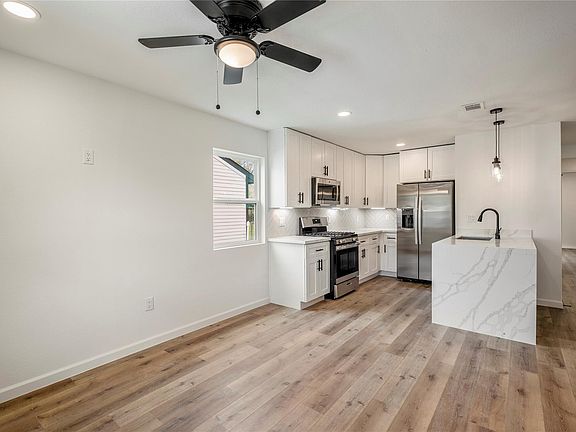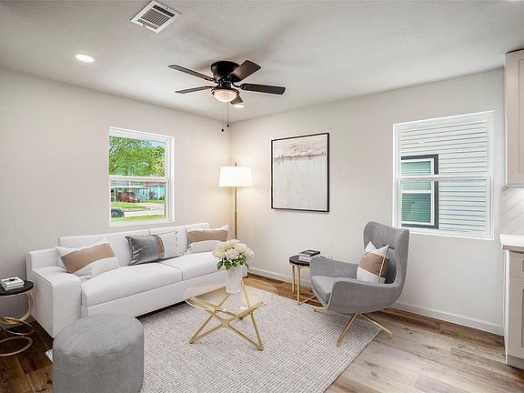 Updated single-story rental with 4 bedrooms and 2 full baths on a quiet, well-located street. Just minutes from Downtown, Hermann Park, the Medical Center, UH, and Hobby Airport. A custom-tiled front porch opens into an airy, open-concept living area. The modern kitchen features a waterfall quartz peninsula, herringbone backsplash, stainless steel LG appliances, and a spacious pantry. Luxury wood-look SPC flooring runs throughout. The primary suite includes a walk-in closet and a versatile nook for a vanity or workspace, plus an ensuite bath with a frameless glass shower and dual sinks. The fully fenced backyard offers a concrete patio for outdoor relaxing or entertaining. Ample driveway and street parking. No HOA and outside the flood zone.