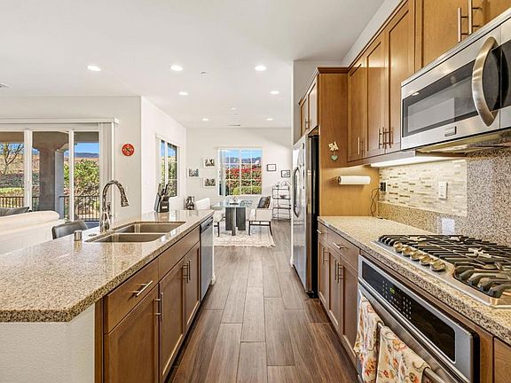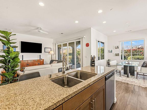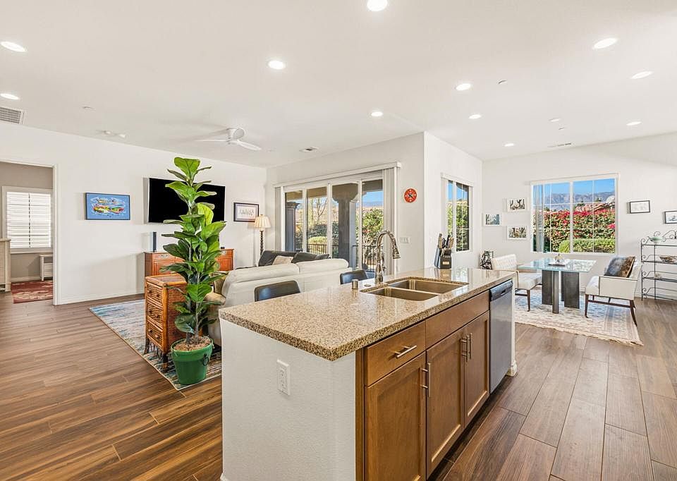 Welcome to Villa Portofino in Palm Desert -- the premier 55-and-better community located in the heart of the Coachella Valley. This exceptional residence offers wonderful mountain views in a quiet, private setting, perfectly blending comfort, style, and convenience. This Positano/Celano Floor Plan has been thoughtfully appointed and shows like new. The interior features porcelain wood-look tile flooring throughout, rich maple cabinetry, and granite and quartz countertops, creating a warm yet modern aesthetic. Lightly lived in, the home feels fresh, clean, and incredibly well-maintained. The open great-room layout is ideal for entertaining or everyday relaxation, complete with sweeping views of the snow-capped mountains. The private back patio is surrounded by mature desert landscaping, offering a peaceful spot to enjoy sunrise coffee or an evening glass of wine. With three bedrooms and two-and-a-half bathrooms, there is ample space for visiting family and friends. The private two-car garage features epoxy-coated floors and built-in storage, and owned solar keeps energy costs exceptionally low. Just steps away is the spectacular 30,000 sq. ft. Clubhouse, offering every amenity imaginable:two restaurants, resort-style pool and spa, full fitness center, yoga studio, movie theater, game room with poker and billiards, and multiple lounges equipped with large-screen TVs. Monthly social events make it easy to stay as active and connected as you choose. Villa Portofino's prime central location puts you minutes from The Shops on El Paseo, The McCallum Theatre, world-class dining, upscale grocery options, and the renowned Eisenhower Medical Center. The HOA covers nearly everything, giving you a true lock-and-leave lifestyle. Don't miss the opportunity to experience this beautiful home -- schedule your private showing today.