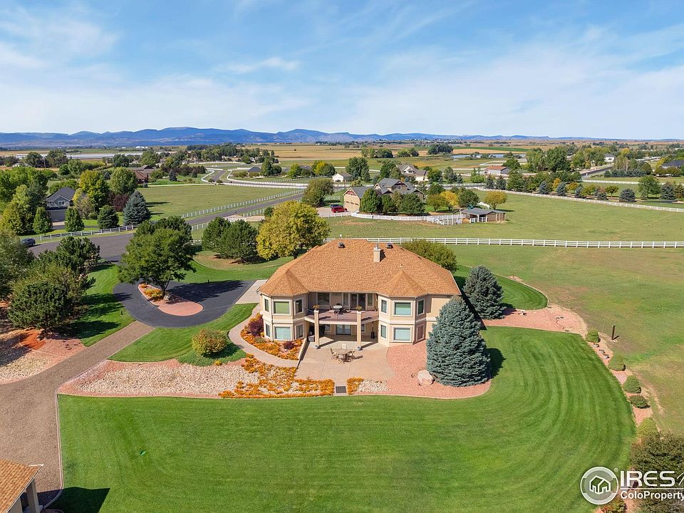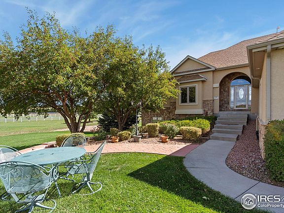 Located on over 5 acres in a gated cul-de-sac community, this property combines quality craftsmanship with superb maintenance. The home features hardwood inlay floors, arched doorways, solid wood doors, and abundant windows showcasing mountain and plains views. The finished walkout basement includes a wet bar, fireplace, and flexible living space, and the primary bathroom offers heated floors for comfort. Outdoor living is maximized with multiple patios and decks, mature landscaping with LED night lighting, and HOA-provided irrigation for crops or pasture. The barn is equipped with box stalls and a heated shop, ideal for equestrian or hobby use, with direct access to community horse trails, arena, and pedestrian paths. The garage is fully finished with epoxy flooring, and the home's condition reflects true pride of ownership-single owner, meticulously maintained, and move-in ready. Every window captures a view, creating a bright and inviting interior throughout. This property offers an exceptional combination of amenities: equestrian facilities, gated privacy, extensive outdoor spaces, and a residence that lives like a show home. A rare opportunity in a premier setting.