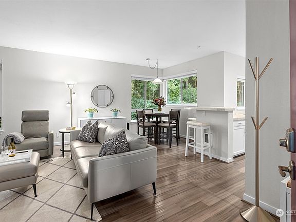 Exquisitely remodeled corner unit 2-bedroom 2-bath home w/ tranquil greenbelt views in desirable Cambria Hills. Completely upgraded for the most discerning homebuyer including grey bamboo flooring throughout & designer kitchen w/ quartz counters, white cabinetry & stainless appliances. Baths have been completely redone w/ high end finishes as well. Primary suite features large walk-in closet. In-unit W/D. Covered patio for relaxing & BBQing w/ storage closet. One-car garage + extra parking spot. Enjoy complex amenities- pool, hot tub, gym + clubhouse. No rental cap & no special assessments. Amazing "Wedge" location w/ great access to Bothell/ Woodinville, 522, I-405 & the Eastside. Two blocks to bike trail. Award-winning Northshore Schools.