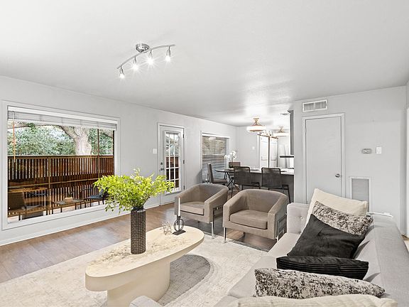 Located near Highland Village, you'll find an amazing opportunity at Foresters Pond Condominiums! This beautifully updated home on the 2nd level features stylish LVP flooring and large picture windows that provide natural light and treetop views in the living room and kitchen. A nearby door leads to a private balcony overlooking the area. The kitchen is bathed in cool gray tones and boasts soft close cabinets and drawers and a stainless steel refrigerator that conveys. Kitchen overlooks the living room at the breakfast bar. A barn door opens to the laundry room where a stackable W/D also stay with the home. A spacious primary bedroom and bath offer comfort and relaxation. The refreshed bath boasts crown molding, a framed mirror, elegant lighting, and a separate space for the tub/shower combination. Secondary bedrooms provide ample space and share access to a second full bath. Enjoy access to a community pool, and a short walk to upscale shopping and restaurants in Highland Village.