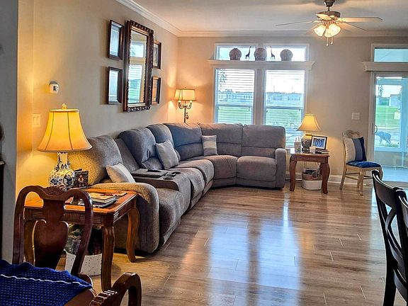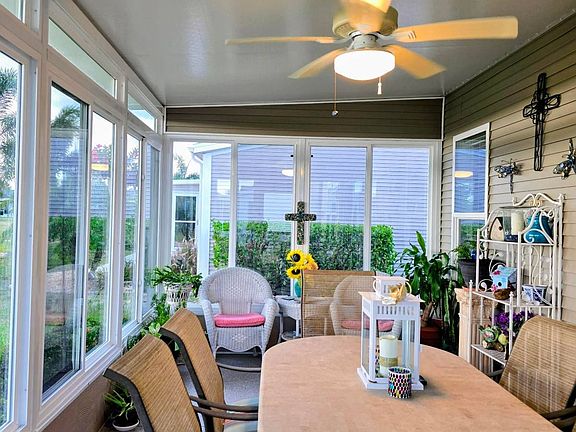 Welcome to a stunning Palm Harbor home located at 3925 Manatee Club Drive, Ruskin, FL 33570 in Premier 55 gated Riverside Club Golf and Marina Community. Enjoy entertaining in this wide open floor plan where the kitchen steals the spotlight. Dream kitchen has a large center island and an abundance of cabinets and counter space. Beautiful pendant lights over the island. Kitchen has stainless steel appliances; upgraded microwave (2025,) large double stainless sink and gorgeous tile backsplash that goes up to ceiling. Tall ceilings, transom windows, crown molding, and newly installed luxury tile wood flooring (2025) greet you at the front door. Being sold furnished. Sofa with 3 electric recliners, heated massage and 2 cooled cup holders plus outlet to charge your phone. A big elegant entertainment center completes this awesome family room. Fully enclosed lanai with ceiling fan and scenic views of hole 13 fairway and green. View magnificent sunsets from the family room, lanai and back of home. Master bedroom and guest bedroom each have walk-in closets. Entire home is painted in soft earth tones enhancing the abundance of natural light. Riverside has 2 clubhouses that both have stage, dance floor and large seating areas. Hayes Bayou has a bar and grill with a view of Little Manatee River and marina. There are tennis courts, pickleball courts, 18-hole golf course, pro shop, workout gym, sauna, 2 heated pools with jacuzzi, woodworking shop, crafts center, library, 40 seat theatre, 2 commercial kitchens, 47 slip marina, boat launch, fishing pier, indoor half basketball court, dog parks, and green spaces plus so much more. Too many wonderful amenities to list. There is an activities director and staff with a manned desk in the Landings. There are so many activities that you have to choose your favorites. Wonderful friendly neighbors throughout the park. This is a community with perimeter fencing and 2 gates.