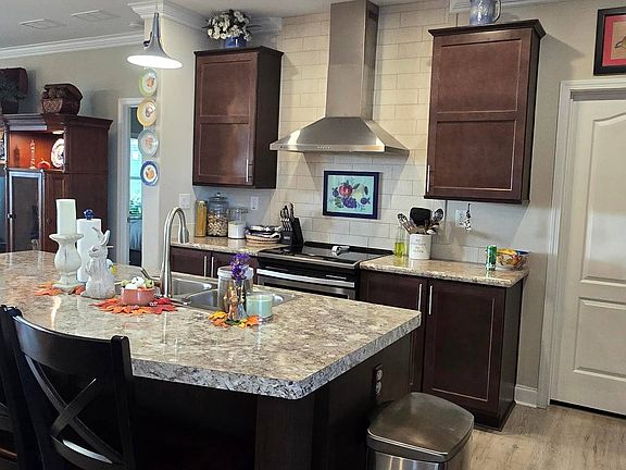 Large center islandTall ceilingsWide open floor planBig elegant entertainment centerTransom windowsCrown moldingStainless steel appliances