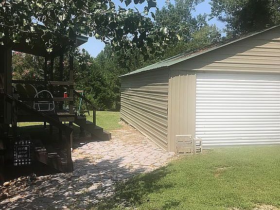 We built it ourselves in 2001, like the houses in Florida on stilts. We’ve since enclosed it because there can be additional rooms built since you can stand underneath the house. It’s been re painted, the exterior of the house, the garage and the porches earlier this year. It has 2.78 acres and some of it is in pasture land. There’s a small creek dividing the property in the pasture, which is full of deer and various wildlife. The garage is detached and the sidewalk is concrete that runs a few feet out from the front porch all the way to the end of the back porch. The front porch is the entire length of the house. It’s got a swing set that was installed from Lowe’s that will remain on the property, pear trees in the backyard along with ornamental flowering trees. 2 large ornamental trees are in the front of the house providing shade and privacy. There’s plenty of parking space and it’s on a private road with just a handful of neighbors. It’s a quiet peaceful little neighborhood well off the main road with lots of privacy. The kitchen has hardwood floors with wainscoting all around. It has a ceramic backsplash the entire length behind the sink and has roosters on it. It has a huge ceramic backsplash behind the stove with a rooster in the middle. The bathroom has linoleum and the washer/dryer is in there also. It has a lodge theme mural of bears on the wall. The smaller bedroom has a garden mural with flowers, rabbits, birds, insects, clouds, bird bath and picket fences all around the walls, it’s beautiful in there. It can accommodate a full size bed and dresser. The attic is in the closet of this bedroom. The main bedroom is painted sage green with a queen size bed, entertainment center and huge dresser . The living room is very long and almost the length of the house with carpet in there and the bedrooms. It does need to be replaced, and it’s painted a light chocolate brown with the lodge theme, we wanted to have a cabin feeling to the home. There’s lots of huge oaks on the side of the property and pasture. We’re selling due to having to relocate, we’ve lived here almost 30 years and love this place. It does have flower beds and everything is kept weeded and the house has nothing growing up against it. In between the living room and kitchen is an archway we built going into the kitchen. The cabinets are oak and the walls are a ecru/ivory color. Both front and back doors are painted green that were matched exactly to the color of the green metal roof. There’s NO leaks on the roof or the garage roof, which has the matching metal green roofing. It’s well maintained and has the installation of satellite boxes for TVs in the living room and both bedrooms. Underneath, we installed hurricane brackets and extra support brackets when we built it. The exterior is a wood siding, like a knotty barn style that is painted a shade of brown. It’s a beautiful smaller home, surrounded by huge trees, rabbits running in the yard, and lots of peace and quiet from the neighbors, which they aren’t close by.
