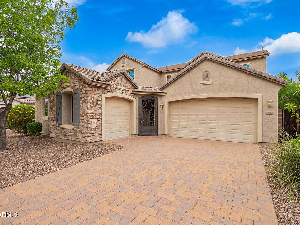 Searching for a spacious East Mesa home with room for everyone? This oversized corner-lot property sits across from a greenbelt with no neighbor behind, offering privacy, a gated courtyard entry, and a family-friendly layout ideal for multi-generational living. The primary suite is located on the main level along with a den and formal dining, giving flexibility for work, guests, or extended family needs. Upstairs features a large loft with a closet that can serve as a fifth bedroom, plus oversized secondary bedrooms for extra space and comfort. The open kitchen is designed for hosting and everyday living, with a large island, gas cooktop, double ovens, stainless steel appliances, & a walk-in pantry. Recent upgrades include fresh interior paint, tile flooring, brand-new carpet, & updated.. window blinds, making this home move-in ready. Outside, enjoy an extended covered patio and low-maintenance synthetic-grass yard, ideal for outdoor living and play. Extra perks include an RV gate, 3-car garage, reverse osmosis system, laundry room plumbing for a sink and gas dryer, and a prime location near excellent schools, parks, and shopping. If you need space, versatility, and a highly desirable East Mesa location, this home checks every box.