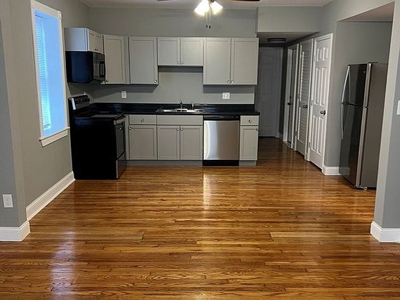 Welcome home to this stylish and well-appointed one-bedroom apartment. The open floorplan creates a bright and airy living space, highlighted by rich hardwood floors that flow throughout. The modern kitchen features sleek grey cabinets, stainless steel appliances, and plenty of counter space, offering both function and style for your daily routine or entertaining guests. For added convenience, the apartment includes washer and dryer hookups located in the basement, along with a dedicated garage space for your vehicle. Thoughtfully designed with a contemporary feel, this apartment offers a comfortable and practical living experience in a location that provides easy access to shopping, dining, and major highways. Schedule your tour today and see all this charming home has to offer.