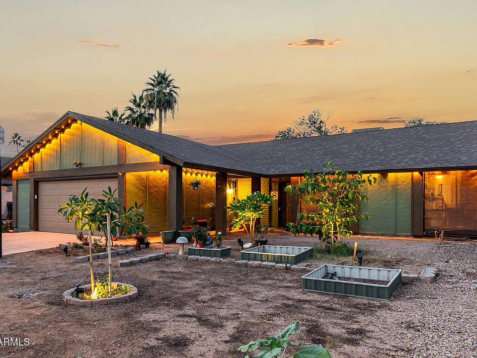 Adorable single-level home in Phoenix! The easy-care front yard is enhanced by young trees that will continue to grow and provide beauty! A lighted façade, 2-car garage, and RV gate add convenience and great curb appeal. Inside, you'll find an L-shaped great room, wood-style floors, custom paint, and a welcoming atmosphere. The eat-in kitchen is equipped with stainless steel appliances, ample counter space, fluorescent lighting, and plenty of cabinets for storage. Spacious main bedroom features a double-door entrance, mirrored closet doors, and a private bathroom. Serene backyard has a covered patio, lush green grass, and a handy storage shed. Steps away from Acoma park, schools, and minutes to the I-17. Enjoy functionality with an inviting style!