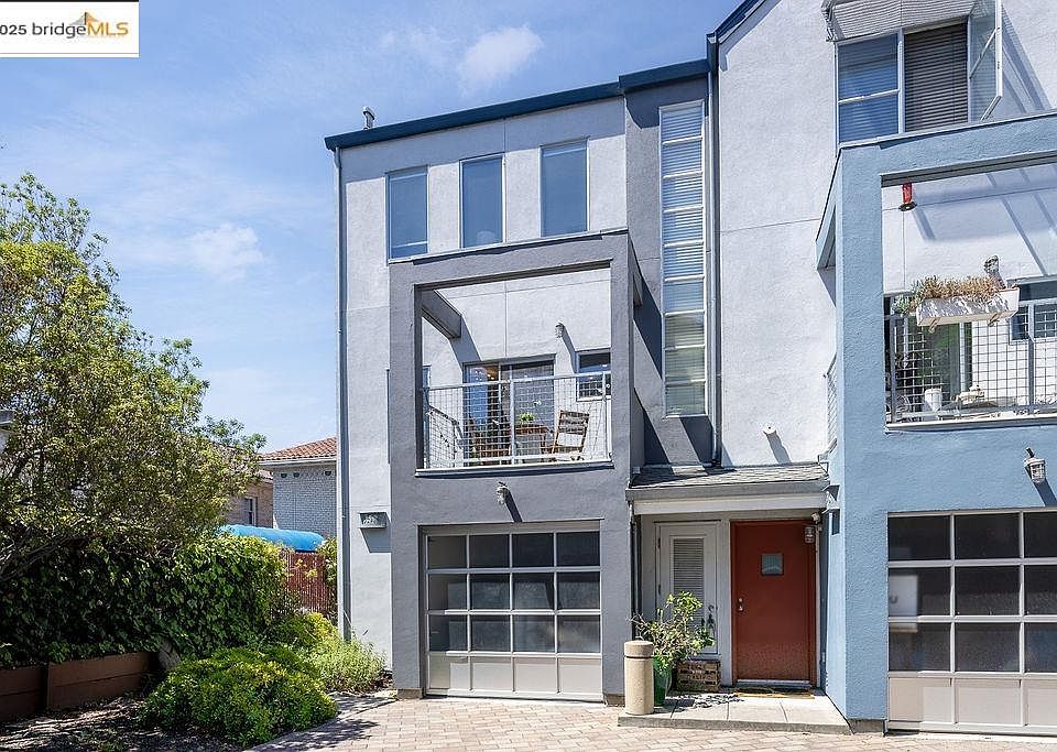 Welcome to this stylish corner-unit townhouse, thoughtfully designed with comfort, flexibility, and modern convenience in mind. An inviting private walkway leads to the front entry, while a side deck offers additional outdoor space. The first floor offers a versatile bedroom with French doors, a generous closet, and a private patio—perfect as a guest retreat or home office. A full bath completes this level. The attached one-car garage is a modern convenience, offering a washer and dryer and an Emporia Level 2 EV charger. Ascending the newly carpeted stairs, the home opens into a sun-drenched living area with soaring ceilings, a ceiling fan, and a striking fireplace. Walls of windows flood the space with natural light throughout the day, while a private balcony expands your living space outdoors. The open layout flows easily into the dining area, accented by additional south-facing windows. The kitchen is outfitted with stainless steel appliances, abundant cabinetry, and its own balcony overlooking the serene courtyard—perfect for morning coffee or evening wine. The staircase leads to the lofted primary suite, a serene escape overlooking the living room below. This upper-level retreat is bathed in natural light from multiple windows and includes a well-sized closet and a second
