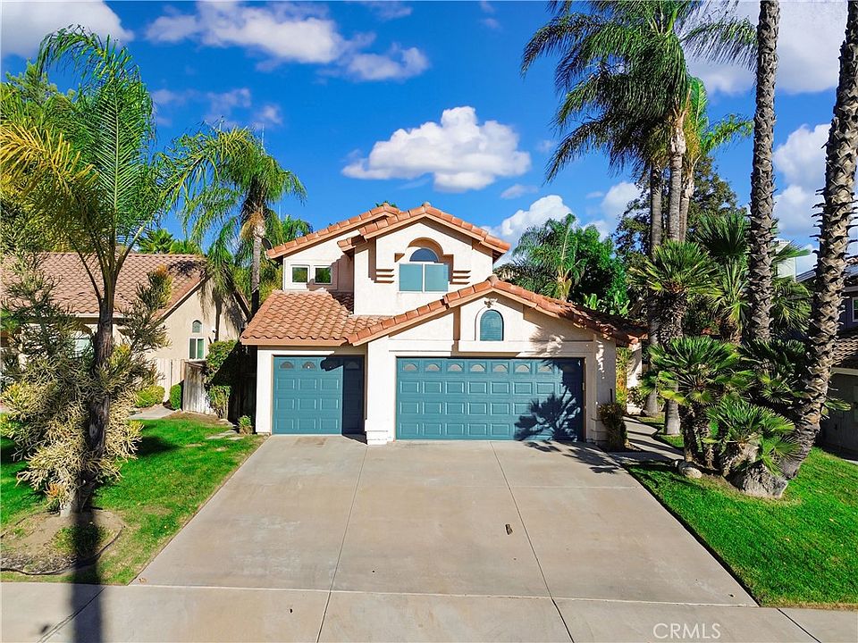 Charming two story Murrieta home featuring 2222 square feet of living space, five bedrooms, and three bathrooms, situated on a spacious 8276 square foot lot with a 3 car garage. This property offers beautiful curb appeal with lush green landscaping and a whole house fan for added comfort. The backyard is perfect for relaxing or entertaining, with a covered patio leading to an inviting in ground pool and spa, your own private oasis. Upon entering, the sitting and dining areas feature wood flooring that flows seamlessly throughout, complemented by abundant windows and a sliding glass door that fills the space with natural light. Straight ahead, a staircase, as well as the hallway leading to spacious living room and kitchen. This living area features a unique design, boasting a ceiling fan, a wood burning fireplace and an additional dining area. Experience indoor outdoor living in the dining area, which opens to backyard through a sliding glass door with views of the pool. The kitchen features granite countertops, white cabinets with ample storage, and bar seating for two. Recessed lighting and a window beyond the sink fill the space with natural light, while stainless steel appliances including a 4 burner stove with a center warmer, oven, and dishwasher add a modern touch. This well designed layout also includes a convenient downstairs full bathroom and a bedroom featuring a window and a closet with sliding mirror doors. Venturing upstairs, you will find vinyl wood flooring throughout, the master, 3 additional bedrooms and a linen cabinet at the top of the stairs. The master bedroom features wood flooring and vaulted ceilings, with a sliding glass door that opens to a private balcony overlooking the backyard oasis. An attached bathroom features a dual sink vanity, jetted soaking bathtub, large walk-in shower, and the closet. The 3 additional bedrooms provide ample comfort, each featuring vinyl wood flooring, windows, vaulted ceilings and closets. The hallway bathroom offers a dual sink vanity, tile floors, and a shower/tub combo. Outside, the backyard is your own personal paradise. Enjoy entertaining under the covered patio or unwind in the stunning custom rock like in ground pool, complete with a slide, spa, and waterfall accents. The lush palm trees, and low maintenance landscaping create a serene environment. The home's location is convenient, with shopping centers, freeways, and highways nearby, offering a perfect blend of comfort and accessibility.