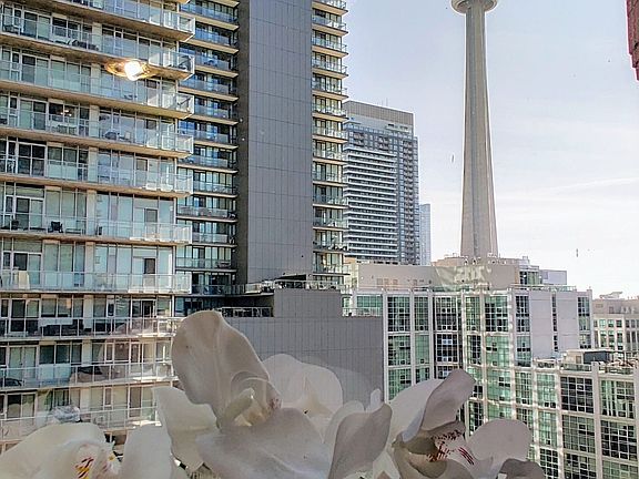 Kings Tower, Top Floor With CN Tower View In The Heart Of Downtown Toronto's Entertainment District. Extra Spacious & Bright-Like A 2 Bedroom suite-Den Has A Door Too. Ready To Move In! EQUIPPED with New Wood Flooring, Bright, Extra High Ceilings, Well Maintained. Fantastic Value With 4 Full Appliances + Ensuite Laundry. Incredible Location - Convenient Access To TTC including two 24 Hour Streetcar lines + St. Andrews Subway Station, Steps away from the best restaurants, cafes, bars, grocery stores. Quick Walk To CN Tower, Rogers Center, Roy Thompson Hall, Scotiabank Theatre, Princess of Wales Theatre And So Much More. Starbucks & Bulk Barn downstairs and Shoppers Drug Mart across the street so all your daily needs are covered. Building Features: On Site Concierge/Security, Visitor Parking, Fob Access For Individual Floors, 3 elevators for only 14 floors means no long elevator waits. Last Month Free On A 1 Year Lease. Amenities Include Rec Centre With Gym, Showers, and Lockers, Billiards Room, Ping Pong, Party Room, PATIO WITH BBQ!! **EXTRAS** Parking and Locker Available at an Additional Cost.