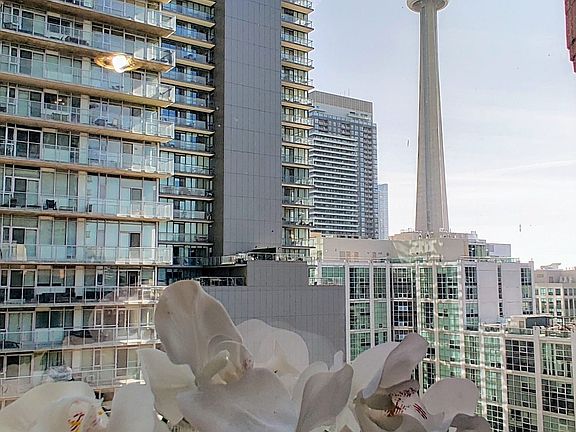 Kings Tower, Top Floor With CN Tower View In The Heart Of Downtown Toronto's Entertainment District. Extra Spacious & Bright 2 Bedroom suite (almost 800 sq.ft) And Ready To Move In! Fully Furnished & Equipped, New Wood Flooring, Bright, Extra High Ceilings, Well Maintained. Fantastic Value With 4 Full Appliances + Ensuite Laundry. Incredible Location - Convenient Access To TTC including two 24 Hour Streetcar lines + St. Andrews Subway Station, Steps away from the best restaurants, cafes, bars, grocery stores. Quick Walk To CN Tower, Rogers Center, Roy Thompson Hall, Scotiabank Theatre, TIFF, Princess of Wales Theatre And So Much More. Starbucks & Bulk Barn downstairs and Shoppers Drug Mart across the street so all your daily needs are covered. Building Features: On Site Concierge/Security, Visitor Parking, Fob Access For Individual Floors, 3 elevators for only 14 floors means no long elevator waits. Amenities Include Rec Centre With Gym, Showers, and Lockers, Billiards Room, Ping Pong, Party Room, PATIO WITH BBQ!! **EXTRAS** Parking and Locker Available at an Additional Cost.