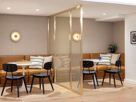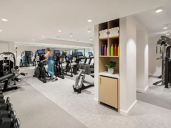 The indoor & outdoor amenity suite at 393 West End Avenue includes a Great Room that offers semi-private interconnected spaces; a Club Room for dining and intimate gatherings; a Fitness Room with state-of-the-art equipment and private movement studio; a Cottage Playroom-inspired by an enchanted forest-with a dedicated porch and secret garden; a lounge with gaming station; private nooks; and private courtyard with landscaped outdoor space.