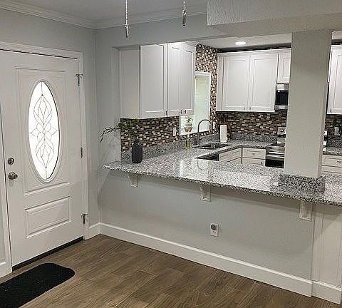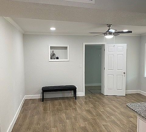 Completely renovated in 2025. Everything is updated or new. New roof, new driveway, 2 new heating & A/C units, new plumbing supply lines, new kitchen, new appliances, new flooring, 9 new ceiling fans, new lighting throughout, new Sheetrock, new painting inside and out, new barn style doors leading to great room, new doors, new stucco on front of house, new vinyl siding on sides and rear, all new windows, new fenced rear yard, new front porch, new utility room with loop for water softener, washer & dryer hookups, both bathrooms renovated,