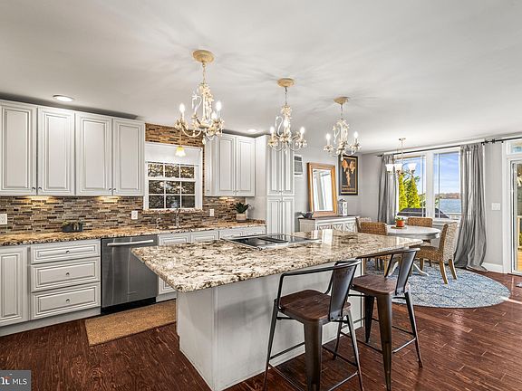 Welcome to your dream waterfront retreat with 50 ft of shoreline at 3930 Glenhurst Road in Dundalk MD! This charming 4-bedroom, 4 full bathroom home offers a perfect blend of comfort and style, with over 2000 square feet of thoughtfully designed living space nestled on a generous 9,100 square foot lot. Step inside and be greeted by the warmth of hardwood floors that flow throughout the main living areas. As you enter, you'll find an open office space and a first-floor primary bedroom complete with an attached, private bath and jacuzzi tub. You'll be drawn into the open concept main living space by the beautiful view overlooking the water and pier. The modern, upgraded kitchen with large granite island is ready for all of your culinary adventures and combines with the dining and living spaces, allowing you to relax and unwind, or entertain in style. Upstairs, a second primary suite is your personal oasis, featuring cathedral ceilings and a private bath with a luxurious jacuzzi tub for ultimate relaxation. As if that wasn't enough, this primary bedroom also has its own private balcony overlooking the water, perfect for your morning coffee or to take in the sunset. Two additional bedrooms share a full bath on the upper level. Each bathroom is tastefully appointed, ensuring convenience and privacy for all. The outdoor spaces are just as inviting, with a large composite deck offering stunning views of the waterfront. Imagine starting your day or hosting evening gatherings while enjoying the serene surroundings. For boating enthusiasts, the private pier with 10,000 lb boat lift combined with a wide body of deep water provides easy access to your aquatic adventures. Great for racing or jet skis! A large, 2 car garage offers privacy and convenience. The garage door openers are mounted on the walls allowing additional space overhead to accommodate larger vehicles. In addition to the garage space, the driveway can hold 4 cars. The shed is a great place to house your yard equipment and tools. The home also features a basement, perfect for extra storage or a creative workspace. With central air conditioning, washer and dryer, and woodstove, your comfort and convenience are always top of mind. No flood insurance is required on this home! Major updates include 10,000 lb boat lift (2020), vinyl bulkhead, stone façade front and back, lifetime architectural shingle roof (2017), 50 gallon hot water heater (2020), new flooring, cabinets, lighting and bathrooms remodeled (2018). Don't miss the chance to make this exceptional waterfront property your own. Experience the perfect blend of tranquility and modern living. Schedule a showing today and start envisioning your new lifestyle!