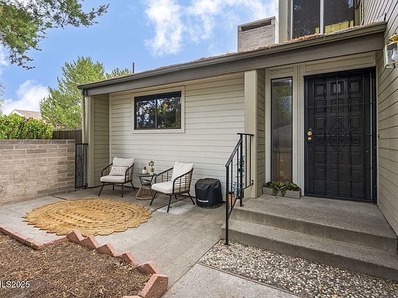 Beautifully updated and centrally located, this condo embodies tidy maximalism at its finest. The home showcases soaring ceilings, built-in planters, an open floor plan, and a double-sided fireplace, currently used as wood-burning but with the option for gas. Natural light pours in through skylights and large windows, with solar screens on upper windows to keep the home cool in summer. Situated on a quiet cul-de-sac, this unit is one of the few in the community with its own private backyard, perfect for gardening or creating a cozy outdoor retreat. The kitchen is updated with sleek leather granite countertops, a wine fridge, and newer appliances. Storage is abundant, including two closets in the primary bedroom. The second bedroom features a loft, ideal for guests or a home office. Conveniently located near the new Moana Springs Aquatic Center, parks, shopping, and restaurants, the property offers easy access to Reno's best amenities. Community features include a pool, tennis courts, a clubhouse, gardening beds, and fully managed exterior maintenance, ensuring stress-free living. This unique, pride-of-ownership condo is move-in ready and waiting for its next owner.