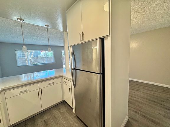 This is a large lower unit that has been completely redone with new cabinet doors, quartz counter tops, stainless steel appliances, vinyl plank floors and two tone paint through out. The kitchen has ample counter space and cabinetry with a small pantry on the side. The complex is fully gated and offers on site laundry.