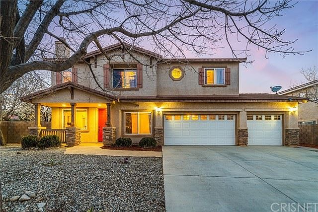 Beautiful Formal Model West Palmdale Pool Home No Mello & No Hoa. Just In Time For Summer! Enter Into the formal living room with fireplace & dining area with laminate wood flooring, off the entry is a spacious den with crown molding & large storage closet. The family room has a fireplace, built in entertainment center & is open to the kitchen with large island, granite counters & stainless-steel appliances overlooking the entertainers back yard. Large downstairs bedroom with a sliding door to the back yard and full bathroom with tub/shower combination. Downstairs laundry room with sink, shelving, cabinets & direct access to the attached 3 car garage. Beautiful wrought iron staircase, recessed lighting are some of the highlights of this home. The primary suite has double door entry, high ceilings, retreat with fireplace & built-in storage cabinets, balcony overlooking the gorgeous back yard as well as massive primary bathroom. Dual sink vanity, large soaking tub with separate walk-in shower, huge walk-in closet with tons of storage. 3 spacious secondary bedrooms, one with their own bath and the other 2 share a jack 'n jill style bathroom. The back yard has everything you will need for a staycation! In ground pool & spa with waterfall, patio, grass area, tropical landscaping, deck with seating area, plus huge play area and block wall fencing.