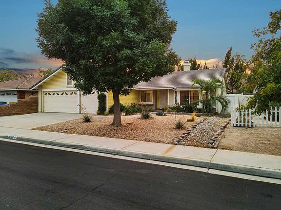This charming single story home can be found in a well desirable neighborhood in West Palmdale. Revel in the curb appeal w/ rock landscaping, large mature trees & green shrubbery. Discover the desirable floor plan and notice bright natural light shining through the slew of windows reflecting on neutral colored walls, brilliant white baseboards & cozy carpet. The massive living room w/ bay window & dining room lead to the chef's kitchen w/ soft maple cabinetry, granite countertops, well-kept tile flooring & stainless steel & white appliances. Off the kitchen is the family room anchored by stunning white brick fireplace. Down the hall find 2 spacious bedrooms making way to the massive master suite. Master has it's own beautiful red brick fireplace & bathroom w/ double vanity & walk-in shower. Use the private sliding door to enjoy the massive & well landscaped backyard. Relax under the covered patio & appreciate manicured lawns & surrounding fencing allowing for ultimate privacy.