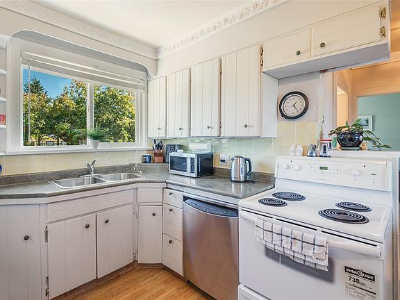 This timeless character home in a central location blends warmth, charm, and everyday function. Inside, original fir floors, archways, and cove ceilings set a welcoming tone. The west-facing living room is light-filled and anchored by a classic all-brick fireplace. The layout flows naturally from living room to kitchen and out to the backyard - ideal for daily life and entertaining. Two bedrooms and a full bath complete the main level, while a bright 275 sqft bonus room upstairs offers creative potential. Downstairs includes another bedroom, laundry, storage, and a workshop. Step outside to a private backyard framed by mature landscaping, plum trees, and Italian Dogwood. A brick-and-slate patio with a built-in BBQ invites connection and calm. With laneway access, a detached carport, and updates like vinyl windows, perimeter drains, and a high-efficiency gas furnace, this home offers presence, practicality, and potential. Call to arrange a private viewing.
