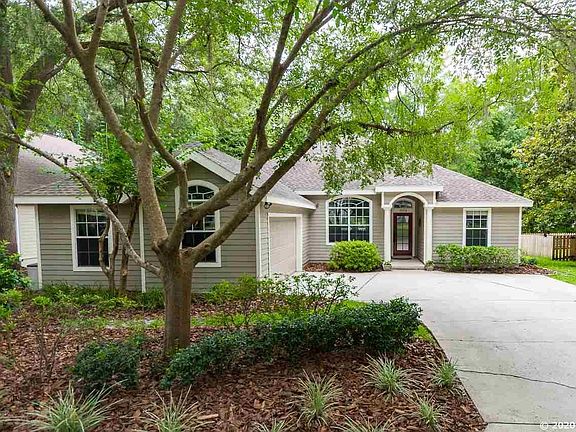 This Immaculate home in Hampstead Park of Haile Plantation is a WOW! Open and bright with 10 foot ceilings this 3 way split floor plan is perfect for everyone! Gorgeous kitchen with custom cabinetry, granite counter tops, top of the line LG stainless appliances plus an island with extra storage space. Great room features built ins, surround sound and gas fireplace with stone accents. Beautiful Hand-scraped wood floors are throughout main living areas and add to the ambiance. Master bedroom has a tray ceiling and large walk in closet along with an updated bathroom. The enclosed sunroom makes the perfect play room or a place to relax with a good book. The backyard is an oasis with fresh pavers and landscaping. The wood deck was recently repainted and makes entertaining a breeze. This home is walking distance to two parks, the Haile Country Club and close to shopping, restaurants and more!