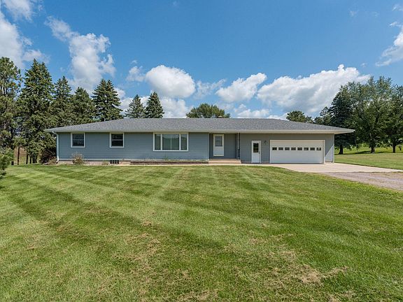 The perfect blend of country living and space with this 4 bedroom, 3 bathroom spacious rambler set on a beautiful 18.67 acre parcel. The home features hardwood floors, stainless steel appliances, radiant heat, and forced-air A/C for year-round comfort. With 4 bedrooms all on one level, the layout is both functional and family-friendly. An oversized, finished two-stall garage with a floor drain adds convenience, while the property includes impressive outbuildings: a 44x100 shed, 40x80 quonset shed, and a 12x40 shed, offering endless storage or hobby space. The home is solid and well cared for & offers an excellent opportunity to update and bring it to today’s modern style. With open acreage and room to grow, this property is ideal for those craving country living.