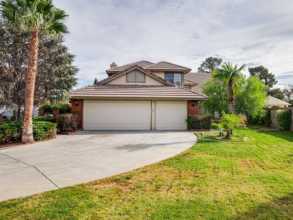 Every REX home comes with a 30-day buyback guarantee. Terms and conditions apply. Absolutely stunning and elegant 4 bedroom, 3 bath home with 2302 square feet in Palmdale! Situated on a cul de sac on an expansive lot complete with a sparkling pool and spa, gated driveway entry and warm and inviting feel with beautiful design details throughout. The living room offers a brick fireplace, soaring ceilings, adjoins a large dining room and features richly hued laminate wood flooring and a bay window. The spacious kitchen has a center island, wood cabinetry, laminate wood floors with an open feel. All of the bedrooms are light and bright with great closet space, and the master offers an en suite bath with dual sinks set on a wood vanity, an arched doorway that leads to the enormous bedroom and a seating area. Pine trees line the yard for even more of a secluded and tranquil feel and the backyard also has a pergola. Gated pool and spa. Separate laundry room. Three car garage and a long driveway are perfect for guests or a large vehicle. Central AC. Double paned windows. Great location, close to the AV Mall, restaurants, shopping, recreation park, and easy access to the 14 Freeway. Fantastic in every way!