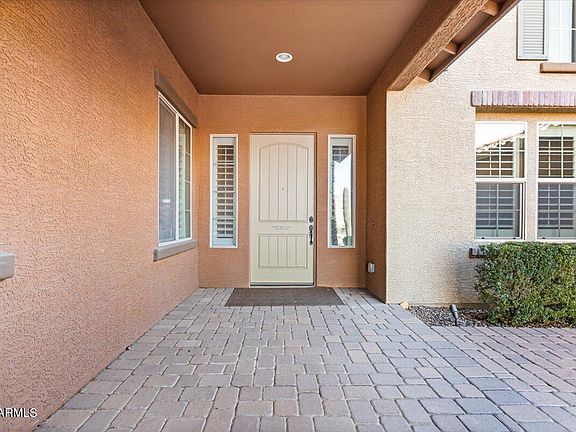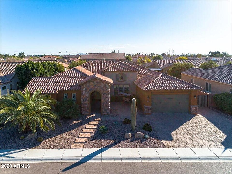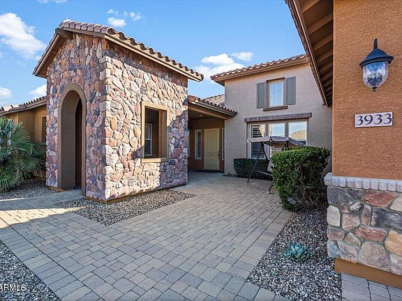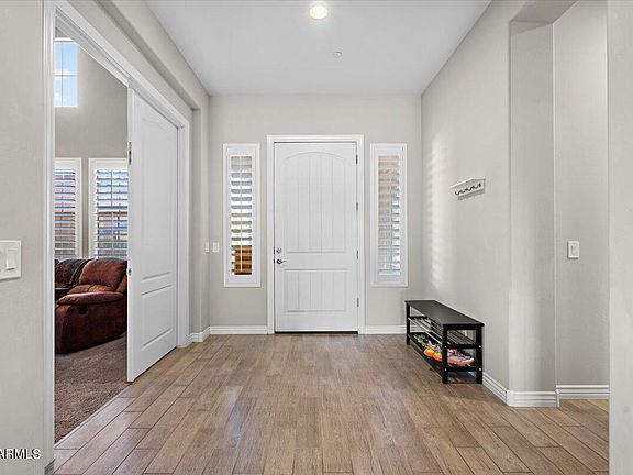 Welcome to this highly desirable Taylor Morrison Telluride.Situated in a desirable gated community this home boasts 10 foot ceilings with recessed lighting in all common areas. Gorgeous wood plank flooring throughout kitchen and living spaces. 108 inch projection screen in great room. The gourmet kitchen features an oversized island with room for everyone. Electric cooktop is plumbed for gas. Spacious pantry and laundry room. The den has stunning 16 foot ceilings with French doors making it ideal for a study or office. You won't want to miss the flex room, set up for a second family room. The split floor plan allows privacy to the Owner's Suite. Entertainers backyard with 6 hole putting green and sandbox along with hot tub, bar, and orange citrus tree. The 4 car tandem garage will keep all of your toys stored safely. Home furnishings and additional items available for sale. This home is a dream. Schedule your tour today