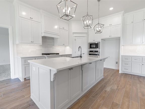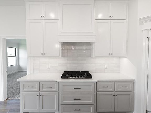 The Hazel floorplan has a total of 2,095 Sqft for living space, including 1,900 Sqft of indoor living and 220 Sqft of outdoor living that features a wood-burning fireplace, a gas line, and a TV hookup! This immaculate home offers 4 bedrooms, 2 full bathrooms, covered patios, a utility room, and a 3-car garage with an in-ground storm shelter installed. The great room presents a beautiful coffered ceiling with a ceiling fan, a gorgeous corner gas fireplace with our stacked stone detail, large 7' windows, rocker switches throughout, and elegant wood-look tile. The high-end kitchen has stainless-steel appliances, including a 5-burner cooktop, decorative tile backsplash, custom-built cabinets to the ceiling with under cabinet lighting and cabinet hardware installed throughout, a large corner pantry, 3 CM countertops, more wood look tile, stunning pendant lighting, and an oversized center island that holds a farm sink, a dishwasher, and a trash can pullout. The primary suite spotlights a sloped ceiling detail with a ceiling fan, windows, and our cozy carpet finish. The spa-like prime bath has a free-standing tub, a dual sink vanity with framed mirrors, 3 CM countertops, a European walk-in shower, a private water closet, and a huge walk-in closet with horizontal and vertical storage opportunities. Secondary bedrooms feature high ceilings with ceiling fans, sizeable closets, windows, and carpeted flooring. Other amenities for this energy efficient home include a tankless water heater, a fresh air ventilation system, R-44 and R-15 insulation, and so much MORE!