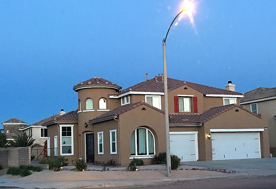HUD Home. This striking two-story Westside Palmdale home enjoys a corner spot in a newer neighborhood just minutes from highly-rated Highland High and close to shopping and the freeway. Desert landscaping in the front yard will save water, and along with the unique "castle turret," show off the curb appeal. Everything about this home is spacious, starting with the entry and living room with a dramatic sweeping staircase. There's a formal dining room adjacent to the gourmet kitchen, sure to please the cook with granite counters, abundant cabinetry and an island/breakfast bar that opens to the family room with a cozy fireplace and dry bar for entertaining. A downstairs bedroom and bath afford convenient accommodation and the laundry room will come in handy at chore time. At the top of the wrought iron staircase are two large lofts perfect for a variety of uses. Double doors lead to the oversized master with walk-in closet and private spa-like bath with dual vanities, garden tub and separate shower. Three more bedrooms and another full bath ensure ample living space. The three-car garage offers plenty of parking and storage space and the pool-sized backyard features a huge covered patio with concrete wrapping around each side of the house.