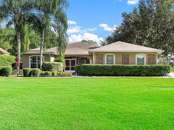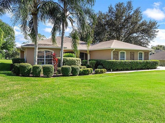 LIKE NEW & AFFORDABLE....GOLFCOURSE FRONTAGE! Discover your next home in a charming, GUARD GATED, all age, Central Florida Golfing community...feel safe and Secure! This beautifully updated home offers peace of mind with replacement of roof (2019), Hot Water Heater (2021) and Septic Drain field replaced (2024)! This "move in ready" home has been remodeled throughout to include freshly painted interior, and replacement of flooring in bedrooms & Primary Bath. You will love the enhanced lighting in tray ceilings and under kitchen cabinets. Additional updates in year 2024 include replacements of exterior electrical box, Air conditioner coil/Compressor, new exterior porch screens, Gutter with "Leaf-Guard" feature, Lanai pavers re sanded and more...Enjoy golf and water views overlooking the 17th fairway and 13th green. This home welcomes you to a manicured lawn, screened double-door entry, and a bright open layout featuring large foyer, formal living plus, family, and dining rooms. The large kitchen boasts a smooth stove top built in a convenient center island, granite counters, a tile backsplash, newer appliances, and a breakfast nook. The Primary suite offers patio access and a spa-like bath with dual vanities, a shower, soaking tub, and glass block window. Your guests will love the privacy that the split plan design offers you to bedroom 2 & 3 (used as a den/ office). Enjoy the amazing, oversized back lanai with an attached, canvas covered birdcage! Plenty of room for your vehicles in the side-entry oversized 2 Car plus Golf Cart Garage with additional space for storage or projects, Tree shaded backyard is perfect for relaxing with sunrise or golf frontage views. For additional fees, residents can have the option to enjoy access to the Country Club amenities including golf, swimming, tennis, pickleball, fitness center, RV/Boat storage and a private marina on Lake Griffin all within the scenic, treed neighborhood featuring sidewalks & rolling hills for your walking pleasure!! Conveniently located just minutes from The Villages and major shopping/dining! Schedule your private tour today you'll love what this home and community have to offer! CALL TODAY with NO REGRETS!!