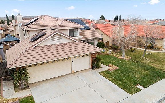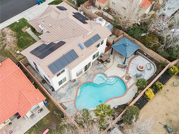 Spectacular 5 bedroom/3 full bath pool home in Palmdale's west side includes a full bedroom/bathroom downstairs. How wonderful is that for your guests?Open the front doors and find yourself walking into this stunner with sunken formal living with cathedral ceilings. Step up into the formal dining room. The open floor plan kitchen has been completely upgraded with granite countertops, neutral tile back splash and black appliances. The kitchen center island faces the family room with its gas burning fireplace and large glass slider opening to the back yard built for entertaining. Even all of the windows along the back of the home have been upgraded.A trip upstairs leads to three additional bedrooms and a very private en-suite with plenty of windows allowing in beautiful natural sunlight. The master bathroom right off of the master suite has a skylight giving you even more natural lighting for the dual sinks and separate shower and toilet area.Let's go back down and check out that entertaining back yard. A pool and spa with water features greet you. There's a patio overhang providing shade on those hot summer days and a fire pit to offer warmth on those cold fall and winter evenings. The back yard is all hardscaped with planters and has an over sized dog run.This home is on a quiet street that has no main thruway to the larger main street. This wonderful home is just waiting for the perfect new family to call it their home... Don't miss out