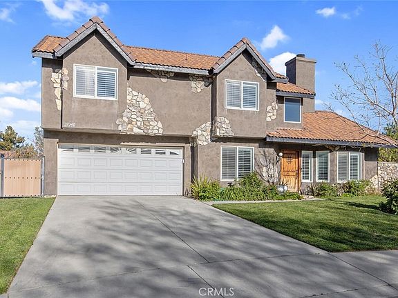 Beautiful 5 bedroom and 3.5 bath detached home located on a tranquil cul de sac street in West Palmdale! This inviting home boasts an open floor plan with tasteful upgrades including stone flooring on the first floor, two sided fireplace to enjoy from your living and dining room, and will accommodate just about any decor and features an incredibly spacious full bedroom and bathroom downstairs with its very own access to the expansive backyard!! The chef's kitchen is open to the family room and dining room and has been upgraded with beautiful granite counters, a lovely center island, plenty of storage! The kitchen and family room gaze over the incredible backyard enclosed with a private stone wall, the perfect balance of hardscape and landscape areas and enough room for 3 swimming pools! The upstairs layout is ideal with 4 spacious bedrooms including the second primary suite which has vaulted ceilings and overlooks the serene backyard! The en suite bath features dual sinks, large soaking tub, separate shower and walk-in closet! 2 secondary bedrooms share the bath complete with dual sinks and tub/shower combo! This home is truly turn key and is one you will keep in the family for years to come!