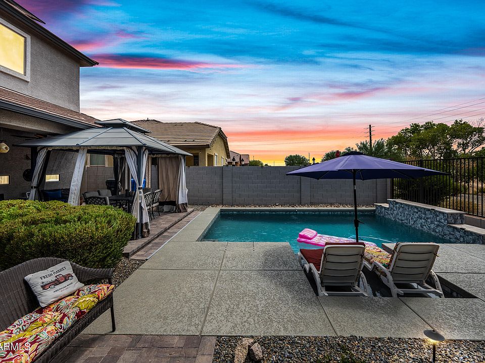 This beautiful home is ready for its next chapter! Blue Spruce is the most competitively priced home in the 85298 area that includes a guest suite! The full Next Gen suite has its own private entrance, garage access, kitchenette, bedroom, bath, and laundry hookups, making it ideal for multigenerational living or giving guests their own space! Since 2021, the owners have added 2 new AC units with air scrubbers, a sparkling pool, a tankless water heater, and solar, keeping the home efficient and comfortable! The open floor plan, spacious kitchen, and oasis of a backyard make it easy to picture life here! Even better, you'll enjoy the extra privacy of single-story neighbors on both sides! Close to top-rated schools, shopping, dining, Gilbert Regional park and more