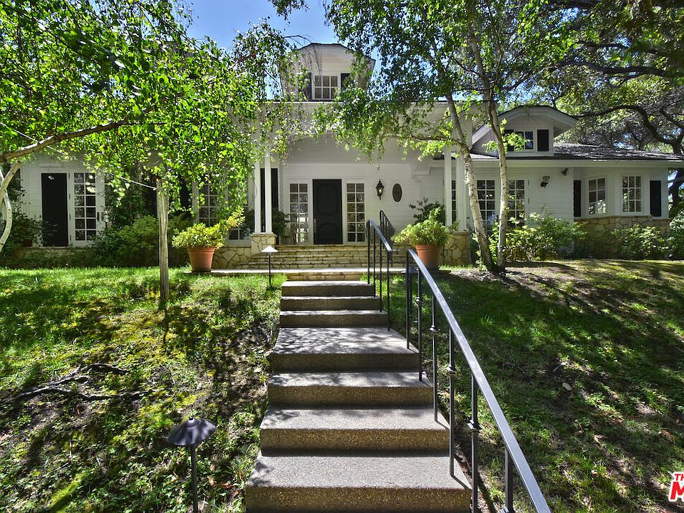 Nestled behind gates on nearly one acre in the prestigious Royal Oaks enclave of Encino, this ICONIC custom single-story gated estate offers unmatched privacy, natural beauty, and timeless design. Located on one of the area's most exclusive streets and surrounded by majestic redwood and oak trees, this exceptional property offers approximately 5,200 sq ft of refined comfort and sophisticated style. The home showcases soaring ceilings, hand-hewn wood beams, and solid wood floors throughout. The expansive layout includes an eat-in chef's kitchen with stainless steel appliances, spacious pantry, prep sink, and a stunning center island all opening through French doors to a beautifully appointed patio for seamless indoor-outdoor flow. The oversized family room features a striking stone fireplace, custom built-ins, wet bar, and multiple sets of French doors that bring in abundant natural light. Elegant formal living and dining rooms offer generous space and scale, ideal for both intimate gatherings and large-scale entertaining. This home has 4 bedrooms including the luxurious primary suite which is its own private retreat with fireplace, spa-inspired bath with dual vanities and glass-enclosed shower, walk-in closet, and direct access to the outdoor patio. A rare and valuable highlight of the property is the detached GUEST HOUSE, complete with a private entrance, living area, full kitchen, the home's 5th bedroom, bath, adit'l 2-car garage, and private patio with garden, perfect for extended family, guests, or creative studio space. The resort-style backyard is a tranquil oasis, featuring lush landscaping, expansive lawn, rock waterfall, fire pit, and multiple covered seating areas ideal for year-round entertaining. This one-of-a-kind estate blends warmth, elegance, and functionality in an irreplaceable location.