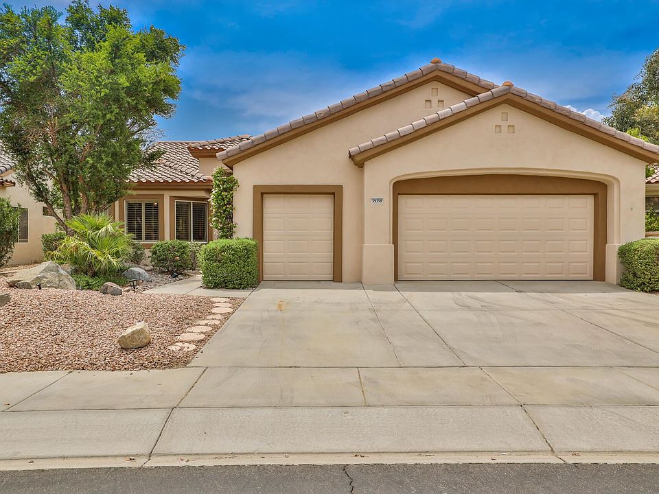 Located in the best 55+ community in the valley, Sun City Palm Desert. This beautiful SW facing St. Croix has 2 primary suites, a den/office, and a powder bath and a huge private backyard. The fabulous kitchen is bright with plantation shutters, prep island, a breakfast nook, and is open to the dining and living room. The exterior has been freshly painted in new contemporary colors and the desert landscaping is easy to maintain. The spacious primary suite has a French door to the backyard, new carpet, walk-in shower, and a walk-in closet. The extended guest suite has a private bath and sitting area, perfect for visitors to feel completely comfortable. The laundry room has cabinets and the washer and dryer are included. The cozy bright office has a pocket door and is away from the noise of the house for a perfect working environment. The garage has a golf cart space, which is now being used as a project work area. Seller will return it to a garage space at the buyer's request. The large backyard allows for a pool, spa, or ponds with waterfalls. It has an 'Alumawood' cover, bougainvillea, a grapefruit tree, and two tangelos. All new rock and gravel allow you to customize the entertaining backyard of your dreams and make it into your perfect oasis. (Seller discloses that the large fountain/waterfall in the backyard does not function and did not function when they bought the home. Buyer to accept the fountain as-is).