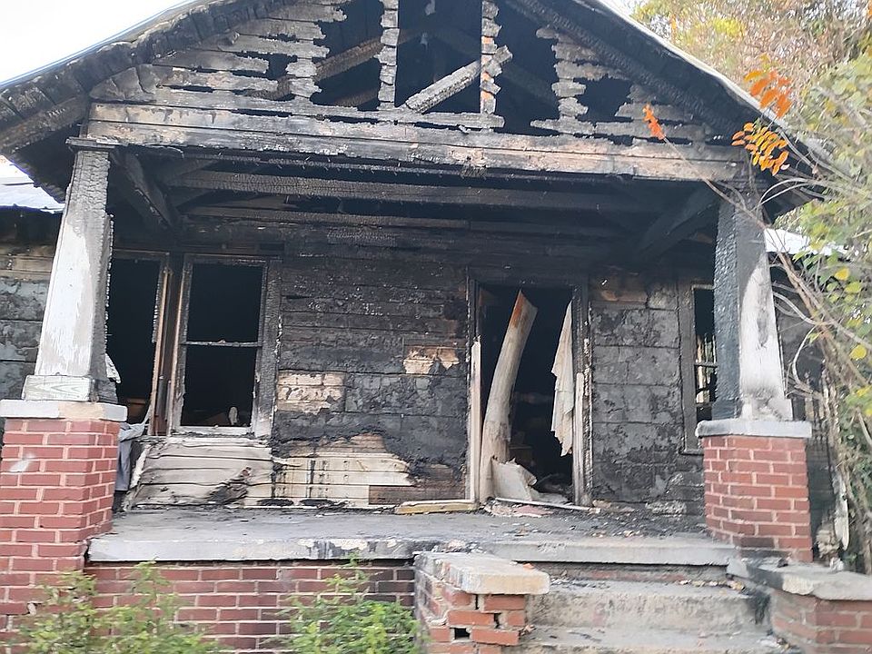 The front is burnt which you can see in the pictures. The living room and side room is burnt and the roof.