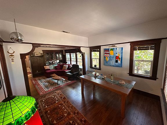 Restored living / dining space with original craftsman wood details including inset cabinetry with original glass.